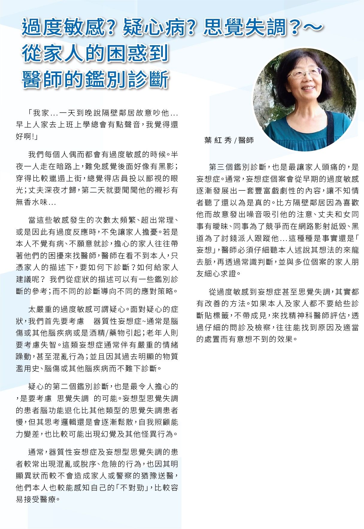 過度敏感?疑心病?思覺師調?~從家人的困惑到醫師的鑑別診斷 /葉紅秀 醫師